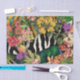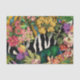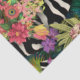 Hübsche rosa Gänsehalben, hellgelbe Freesias und dunkelgrüne Blätter aus Palmen schmücken ein breites Diagonalband aus schwarz-weißem Zebradruck und einen indischen, gelb-türkisfarbenen Ausdruck. Das Ergebnis ist eine tropische, blumengeschmückte Collage, die einen dramatischen Pop der Farbe hinzufügen wird.