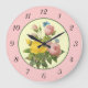 Eine Wanduhr mit rosa und gelben Rosen aus Vintagen botanischen Kunstwerken mit blauen Schmetterlingen auf einem Imitat Pergament Hintergrund und antiken Zahlen in schwarz auf einem rosa Hintergrund.