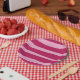 handgezeichnete, rosa gestreifte Papiertafel für Picknick, Party oder Soirees für Kinder, 1. Geburtstag, Party für Kinder, Kinderdusche, Hochzeit, Brautparty, Party für Erwachsene, 30. Geburtstag, 40.