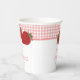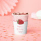 Diese Papiertasse ist bereit, um mit Ihren eigenen Nachrichten mit einem Ort, um eine Nachricht auf der Vorder-und auf der Rückseite. Sie sind mit rosa Gingham und reifen roten Erdbeeren übersät. Ihre Nachrichten erscheinen in der Koordination von rosa Buchstaben.