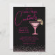 Diese Einladung enthält ein Party zum Thema Ladys Night Cocktail auf schwarzem Hintergrund. Die Informationen zum Party werden in einem neonrosa Schriftart gedruckt, wobei der Titel "Cocktails" in einem eleganten Drehbuch gedruckt wird. Unter dem Veranstaltungstitel befindet sich ein glamouröses, rosa Glitzer-Martini-Drink mit einem Zitronenkeil aus Gold des Glitzer. Rosa Glitzer Konfetti betont den unteren Teil.