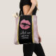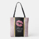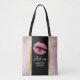 Makeup Business Tote Tasche, die sagt" Frag mir von meinem Lisptick. Entworfen mit einem Hintergrund komponiert mit einer modernen trendigen Rose goldgelben tropischen Blätter Muster. Oben platziert ist ein schwarzer Rahmen mit einem goldenen Farbverlauf, innen sind rosa glitschig lips.