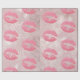 Gemustertes Verpackungspapier mit einem Hintergrund, der mit einer modernen trendigen Rose goldgelben tropischen Blätter. Oben platziert sind pinkfarbene, glitzernde Lippen in einem sich wiederholenden Muster.