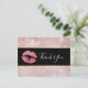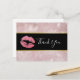 Vielen Dank Postcard mit einem Hintergrund bestehend aus Rose Gold tropischen Blätter. Oben platziert ist ein schwarzer Rahmen mit einem goldenen Farbverlauf, innen sind rosa glitschig lips.