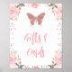 Rosa Glitzer Schmetterlingskarte und Geschenke Schild Sweet Schmetterling Thema Geburtstagsparty-Zeichen mit zwei schönen Aquarell rosa Blumenarrangements und Imitat rosa Glitzer Schmetterling. Diese süße Schmetterlinge Geburtstagsgeschenk Design ist eine niedliche Ergänzung für Ihre kleinen Mädels Schmetterling themed First Geburtstagsparty.