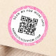 Elegantes, rundes QR-Codeletikett mit kreisförmigem Text und bedrucktem rosa Glitzer (simuliert in der Grafik). Folgen Sie uns auf Instagram: @business.perfect custom und Facebook: @business stationery for business related products, news and sales