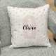 Personalisiertes Mädchenwerfer-Kissen mit rosa goldfarbenem, ästhetischem Monogramm-Namen mit kleinen Herzen im Hintergrund.