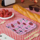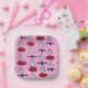 Niedliches Halloween-Print mit Fledermäusen, Gespenstern und Kürbislaternen auf einem rosa Hintergrund.