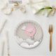 Geburtstags-Party-Teller, der eine Illustration eines rosa Heißluftballons schwimmt in die Wolken kennzeichnet. Personifizieren Sie den Namen und das Alter.