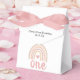 Niedliche First Birthday Gefallen Box mit einem boho Regenbogen in mutierten Pastellfarben und einem rosa Herz in der Mitte. Unten ist "eins" im Skript zusammen mit Ihrem Namen, Event Titel und Datum. Diese individuellen Gefälligkeitsboxen sind eine großartige Möglichkeit, den Gastgeschenken eine persönliche Touch für das erste Geburtstagsgeschenk Ihrer Tochter hinzuzufügen.