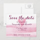 eine Save the Date Postkarte mit einem rosa, skizzenhaften Herz auf einem rosa Aquarell.