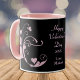Diese hübsche Valentinstag-Tasse hat ein wunderschönes rosa Imitat Glitzer Herz wirl-Design vor einem dramatischen schwarzen Hintergrund. Das Bild wird zweimal auf der Tasse gedruckt, mit Textfeldern, die Sie in der Mitte anpassen können. Es zeigt einen Valentinstag Gruß, aber man kann es leicht auf alles ändern, was man möchte. *Bitte beachten Sie, dass das Bild gedruckt ist und keinen Glitzer enthält.