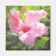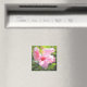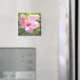 Das Originalfoto von MaeFlowers auf diesem Magnet zeigt eine rosa Hibiskus-Blume im Morgensonnenlicht vor einem Hintergrund von grünen Blätter. Eine der Blütenblätter der Blume, die noch im Schatten liegt, ist mit Regentropfen aus einer Dusche am frühen Morgen ausgestattet. Die Farbtöne und die Grüntöne schaffen eine schöne Gartenstimmung.