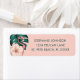 Ein eleganter rosa Flamingo mit einem tropischen Hibiskus wird vor einem aquamarinen, grünen Monsterablatt auf hellrosa Hintergrund angezeigt. Dieses feminine Rücksendelabel ist Teil unserer Floral Florida Flamingos Kollektion.