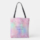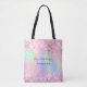 Ein angesagter holografischer Hintergrund mit eintönigen Farben und Regenbogenfarben in Rosa, lila, Minzgrün. Dekoriert mit rosa Konfetti. Personalisieren und fügen Sie Ihren Namen, Titel.