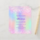 Eine mädchenhafte und weibliche Quinceañera Party Einladung. vorne: Regenbogen, holografischer Hintergrund in lila, rosa, minzgrün. Dekoriert mit rosafarbenen Konfetti. Personalisieren und fügen Sie einen Namen und Party-Details hinzu. Der Name wird mit einem handgeschriebenen Stilskript geschrieben, lila Buchstaben. 1 Blatt = 1 Einladung mit Druckkante bis Kante.
