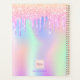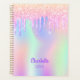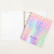 Ein angesagter holografischer Hintergrund mit Einhorn- und Regenbogenpastellfarben in Rosa, lila Minzgrün. Dekoriert mit Imitaten Tropfen in Rosa und lila. Personalisieren und fügen Sie einen Namen, geschrieben mit einem mädchenhaften modernen handgeschriebenen Stil Skript. Fügen Sie ein Jahr hinzu. Lila Buchstaben.