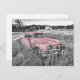 Ein atemberaubend rosa Vintages, klassisches Auto vor schwarz-weißem Hintergrund sorgt für ein einzigartiges Design