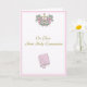 Erste Heilige Kommunion Gratulationen in Rosa mit Kreuz, Blume und Bibel.