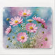 Mehrere rosa Kosmos-Blume mit zarten Blütenblättern sind Set vor einem weichen, wasserfarbigen Hintergrund in Blau und lila Farbtönen