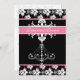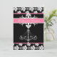 Rosa Kronleuchter-Probe-Esskarten mit weißem Kronleuchter und Damast-Druck auf schwarzem Hintergrund und rosa Zierleisten. Sie sind einfach mit all Ihren Probe-Dinner-Besonderheiten anzupassen, und wir haben auch die passenden Einladungen für Hochzeiten, Brautdusche und Duscheinladungen, RSVP-Karten, Dankeschön-Notizen, Informationsblätter, Aufkleber, Porto und vieles mehr!