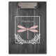 Zieh Notizen und Erinnerungen auf einer sicheren Oberfläche mit einer rosa Dragonfly Rustic Personalisiert Clipboard. Im Clipboard-Design erwartet Sie eine lebendige Libelle mit zarten Blättern und dunkelgrauem, rustikalem Holzhintergrund. Zusätzliche Geschenkartikel in diesem Design sowie eine Vielzahl von Farben.