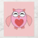 Dieses phantastische Blatt Weinflaschenschild zeichnet sich durch einen niedlichen Cartoon einer rosa Eule mit schläfrigen Augen, einen kleinen Schnabel und niedliche kleine Füße aus. Die Eule hat ein großes Herz aus roter Liebe inmitten ihres Bauches und die Flügel sind weit offen, um jemanden zu umarmen.