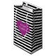 Personalisierte Geschenktasche mit rosa Herz auf schwarz-weiß gestreiftem Muster. Um den Text auf der Vorder- und Rückseite zu personalisieren, geben Sie einfach Ihren eigenen Namen, Text und Datum in die Vorlagenfelder ein. Passendes Party Zubehör erhältlich.
