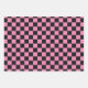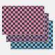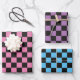 Schwarz-rosa kariertes Packpapier, schwarz-blau kariertes Packpapier und lila-schwarz kariertes Packpapier.