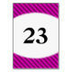 Diese Tafelkarte weist diagonal rosa/lila Streifen auf und weist eine anpassbare Tischnummer in einer Spritzer-ähnlichen Form auf.