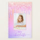 Ein trendiger Hintergrund mit Pastellfarben in Rosa, lila. Dekoriert mit Imitaten Glitzer Tropfen in Rosa, lila und Regenbogenfarben eingetaucht. Lila Buchstaben. Personalisieren und fügen Sie Ihren Namen mit einem modernen handgeschriebenen Stil Skript mit Swashes. Um die Swashes behalten, löschen Sie nur den Beispielnamen, verlass die Leerzeichen oder Emoji's vor und nach dem Namen. Fügen Sie Ihr eigenes Foto und ein Jahr 20xx.