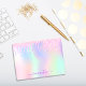 Ein trendiger, irisierender Hintergrund mit Einhorn- und Regenbogenpastellfarben in Rosa, lila, Rose Gold, Minzgrün. Dekoriert mit Imitaten Glitzer Tropfen in Rose Gold, Rosa und lila. Lila Buchstaben. Personalisieren Sie Ihren Namen und fügen Sie ihn hinzu. Der Name wird mit einem modernen handgeschriebenen Stilskript mit Swashes geschrieben. Um die Swashes behalten, löschen Sie nur den Beispielnamen, verlass die Leerzeichen oder Emoji's vor und nach dem Namen.