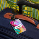 Personalisierte Gepäckmarke mit extravagantem künstlerisch abstraktem Design. Wasserfarbenmalerei mit Farbmischungen und -mischungen, die ein fließendes Marmormuster erzeugen. Ein weißer Rahmen mit einem Imitat mit goldener Folienabdeckung überlagert mit einem personalisierten Text, der innen geschrieben ist.