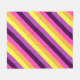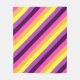 Eine mittelgroße Fleecedecke mit einem niedlichen, farbenfrohen Muster aus diagonalen Streifen in Pflaume lila, Lavendel, Zitronengelb, Melonorange und heller Magenta.