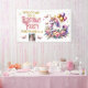 Personalisiertes Geburtstagsbanner. Niedliches magisches Einhorn mit lila, rosa und goldenen Akzenten umgeben von Blume, Schmetterlingen und Glitzern. Märchenhaftes Thema für die Geburtstagsfeier eines kleinen Mädchens. Fügen Sie das Bild Ihres Kindes in den personalisierenden Bereich ein.