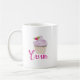 Eine Tasse mit dem Text Yum! Entworfen mit einer Illustration eines leckeren Kuchens mit rosa Wirbel und einer Beere mit Blätter, die im Zuckerguss eingebettet sind.