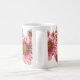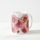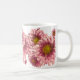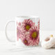 Diese hübsche dekorative Tasse besticht durch exquisite rosa Chrysanthemen. Die Blütenfarben reichen von blass bis tief magenta bis hin zur Mitte. Die Zentren sind grün und gelb.