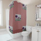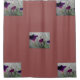 Die Bilder auf dem rosa mit Blumenduschvorhang besteht aus den rosa-lila Winden-Wildblumen, die entlang einem grauen, hölzernen Zaun auf dem Morgen eines sonnigen Sommers gehockt werden.
