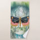 Eine zarte rosa und braune Motte vor dem Hintergrund eines blauen und grünen geheimnisvollen Waldes.