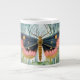 Eine zarte rosa und braune Motte vor dem Hintergrund eines blauen und grünen geheimnisvollen Waldes.