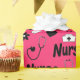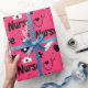 Reizvolles nahtloses Muster-Verpackungspapier mit dem Wort Pfleger und medizinischen Essentials wie Stethoskopen, Spritzen, Medizinflaschen und Pflegerbechern auf einem sanften rosa Hintergrund. Dieses spielerische Gesundheitsdesign kombiniert feminine Farben mit pflegethematischen Elementen und ist ideal für Pfleger, Pflegestudenten, Gesundheitsarbeiter und Mediziner.