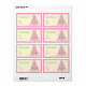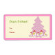 Rosa Niedliches Weihnachtsbaumschneelabel. Ein niedliches Weihnachtsdesign mit einem blauen Weihnachtsbaum voller Schneemänner und Schneeflocken. Rosa Grenze. Personalisieren Sie es mit Ihrem Text.