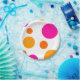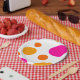 Weiße Platte mit grafischem rosa gelbem und orange Tupfenmuster. Hintergrundfarbe kann besonders angefertigt werden.