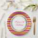 Geburtstagspapier Teller mit elegantem Muster aus rosa, orangefarbenen und goldgelben, horizontalen Streifen. Ein weißer Kreis mit goldenem Farbverlauf, der durch die Mitte mit dem Text in der Mitte angeordnet ist.
