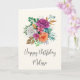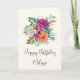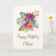 Geburtstagskarte mit einer Blume mit hübschen Rosen in Rosa, Orange und Weiß, umgeben von grünen Blätter.