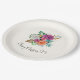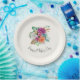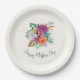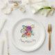 Teller aus Papier mit einer Blume mit hübschen Rosen in Rosa, Orange und Weiß, umgeben von grünen Blätter.