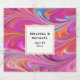 Hochzeitsflaschen-Etiketten mit einem coolen, trippy-psychedelischen Design. Rosa, Orange und blaue Farbtöne, die sich alle umkreisen. Retro Hippie Vibe.