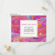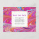 Save the Date Postkarte mit einem coolen trippy psychedelic Design. Rosa, Orange und blaue Farbtöne, die sich alle umkreisen. Retro Hippie Vibe.