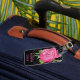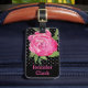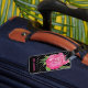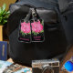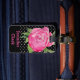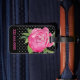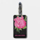 Der elegante Gepäckumbau, der im Schwarzen mit kleinen weißen Polkapunkten getan werden und die Watercolorgrafik einer hübschen rosa Pfingstrosen-Blume blühen. Personifizieren Sie den rosa Text, auf der Front und der Rückseite, um zu lesen was Sie wollen. Reizende Weise, Ihr Gepäck von weitem zu beschmutzen.