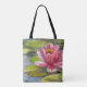 Empfindliche rosa Blume, die auf warmen grünen Lilienauflagen mit reizenden Reflexionen des blauen Himmels im Wasser stillsteht. Freundlich gerahmt durch eine schwarze Grenze auf der Front dieser Tasche… und volle Abdeckung auf der Rückseite, die oben näher an dieser kleinen Malerei laut summt, um mehr zu sehen, Details zu bürsten.